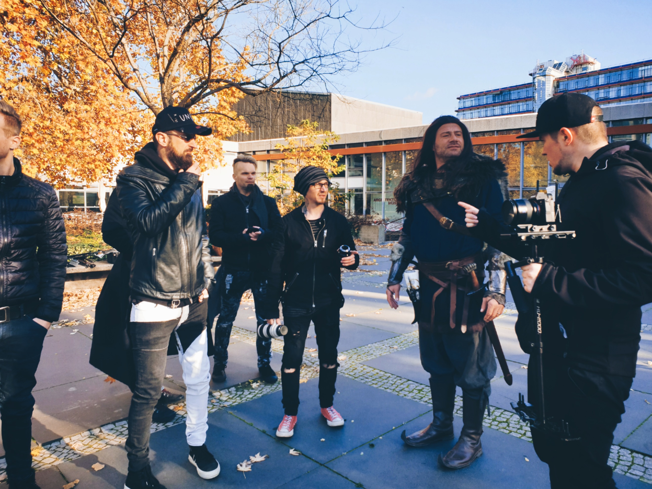 Es hat sich herausgestellt, dass das die richtige Entscheidung war, denn am Drehtag war es eiskalt, der Wind pfiff uns um die Ohren. Glücklicherweise konnte ich mich ja in 5 Schichten einhüllen, da ich nicht vor die Kamera musste. Noch nicht 😉 Die anderen hatten da etwas mehr zu leiden. Umso mehr hatten sie sich das wärmende Menü später am Tag verdient. Wir standen also in den Straßen von Berlin. Eine Handvoll auffällige Personen, darunter ein Vikinger auf einem E-Roller – Sasha. Schon alleine die Blicke der Leute zu beobachten war ein Spaß. Es muss so absurd auf andere gewirkt haben! 😀 Naja, das war es ja auch.